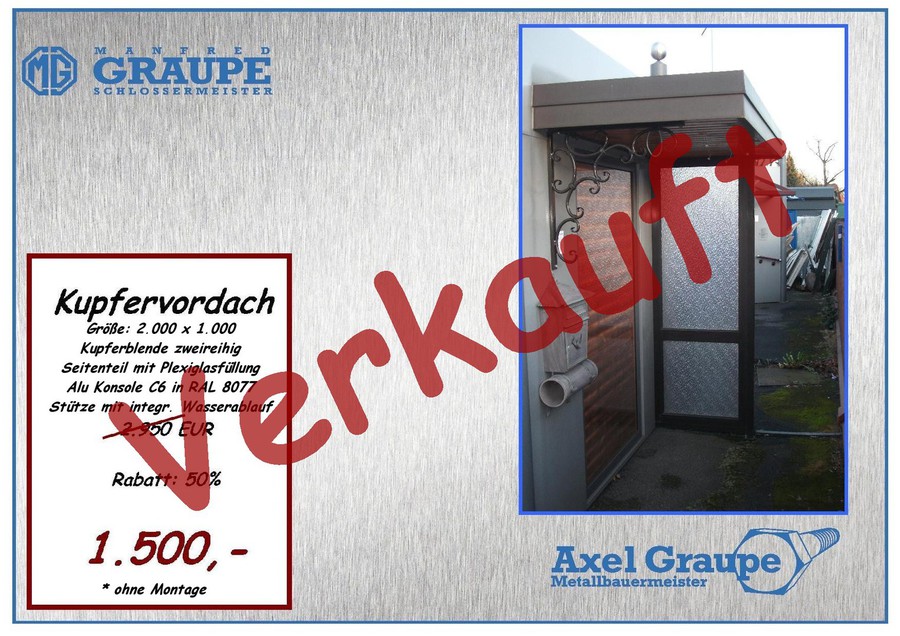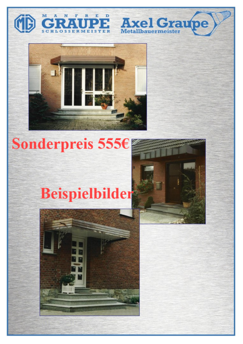 Nutzen Sie die Gelegenheit, unsere Ausstellungsvordächer und Haustürfüllungen mit bis zu 70 % Rabatt zu erstehen. Günstiger ist nur Massenware aus dem Baumarkt.