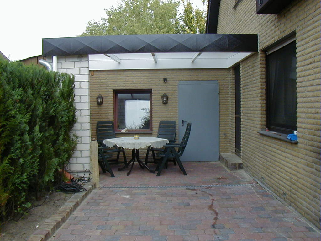 Terrassenüberdachungen mit innenliegendem Gefälle und meist mit Plexiglasabdeckung. Diese Konstruktionen eignen sich speziell für Anbauten an Flachdächer, Winkelbungalows oder bei niedrigem Dachüberstand.